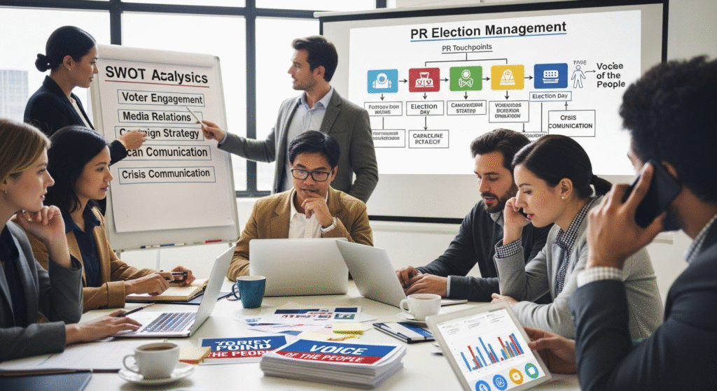 Strategic Communication that Builds Influence Our PR team creates campaigns that build credibility, connect with audiences, and strengthen reputation. From media outreach to influencer partnerships, we craft narratives that resonate. For election management, we specialize in voter engagement strategies, campaign branding, digital promotions, and event handling, ensuring a strong, impactful presence that drives results on-ground and online.